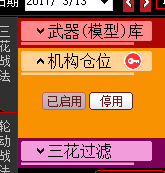 二、用法:图中分三部分:1、武器(模型)库 2、机构仓位 3、三花过滤均为私享家功能。