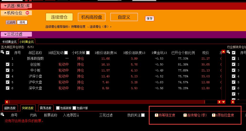 2、严格筛选会用机构高控盘进行过滤,简单筛选会用连续增仓进行过滤,超跌筛选不会进行过滤,直接进入黄金坑超跌股票池。