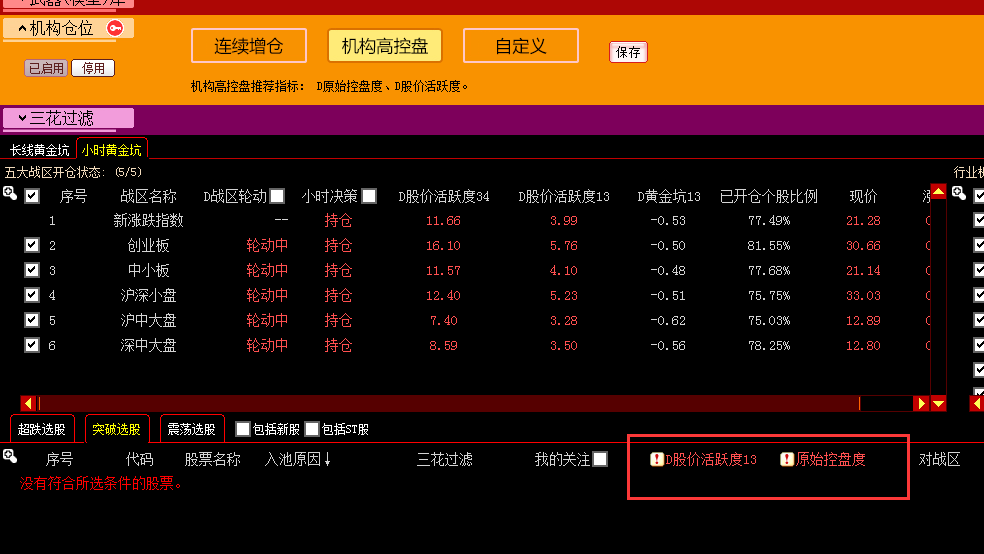 2、机构高控盘:点此过滤会自动启用原始控盘度和股价活跃度13两个指标进行过滤,数值越大越好。