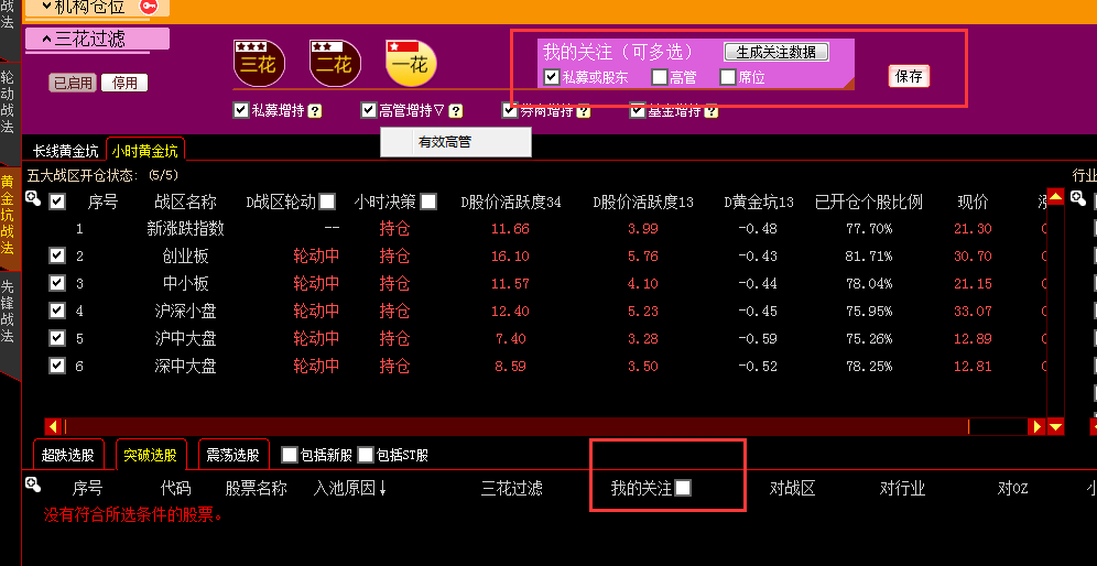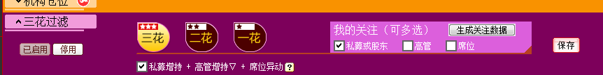 三花过滤右侧有个性定制选项,用户可将关注的私募,高管,席位分别在对应功能中加入我的关注,列布局中会增加对应关注股票的筛选。