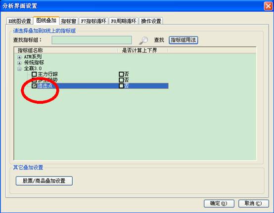 点击k线图上方的设置,调出分析界面窗口,如下图,选择”图线叠加”选项à“全赢3.0” à选中“追击点”点击确定就可以调出该指标