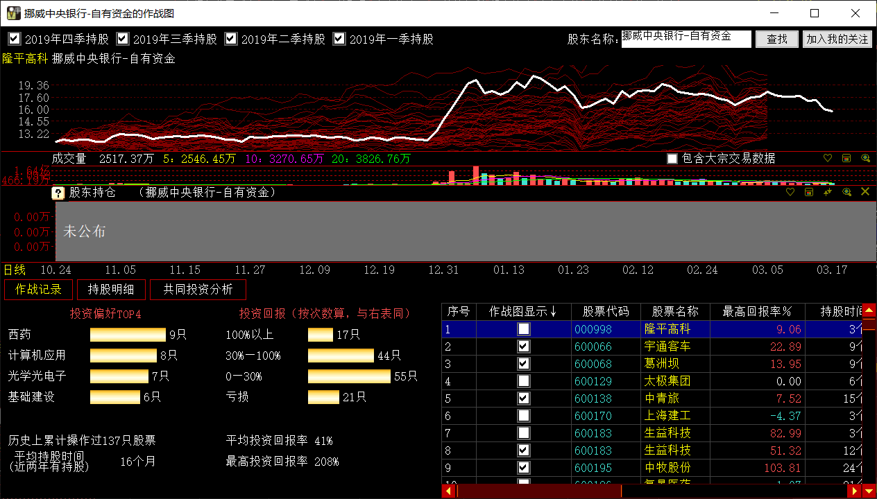 该界面主要由三部分组成:投资股票的走势图、股东持仓、外资机构的作战分析。其中外资机构的作战分析包括投资偏好、投资回报、作战记录、持股明细、共同投资分析五部分。