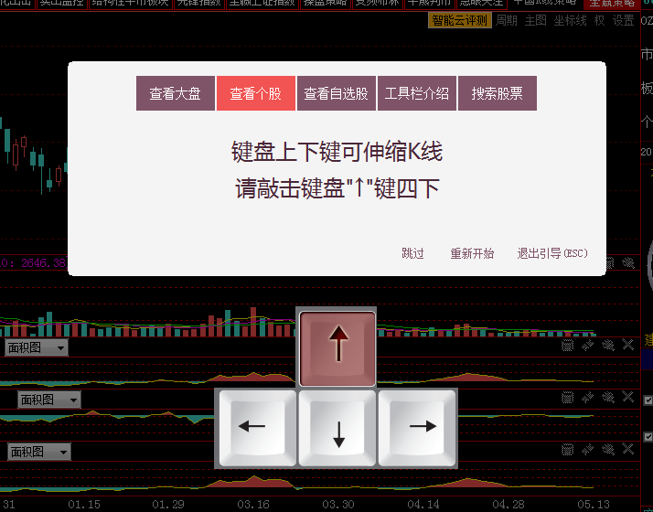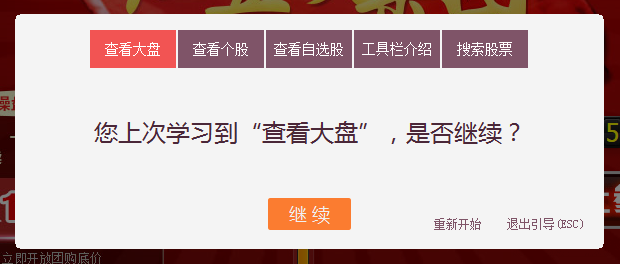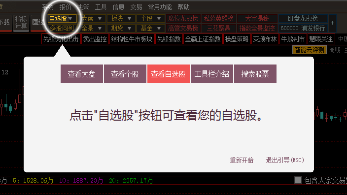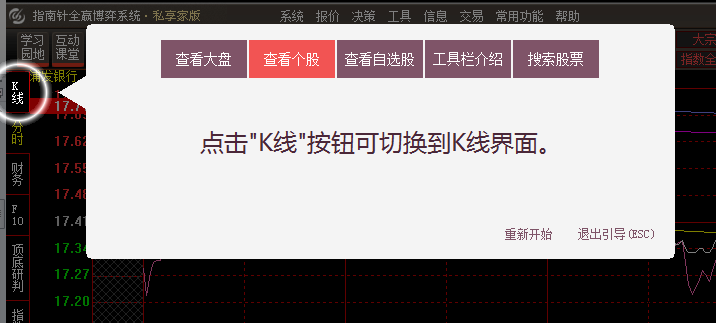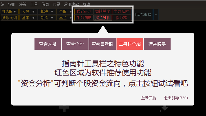 注2:每一步引导均设置重新开始和退出引导(ESC),点击“重新开始”可从头再进行学习,点击“退出引导(ESC)”或按键盘的ESC键可直接退出。