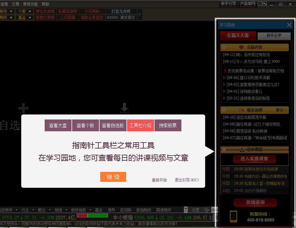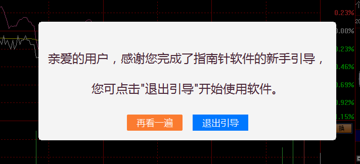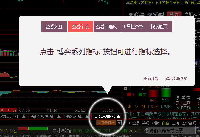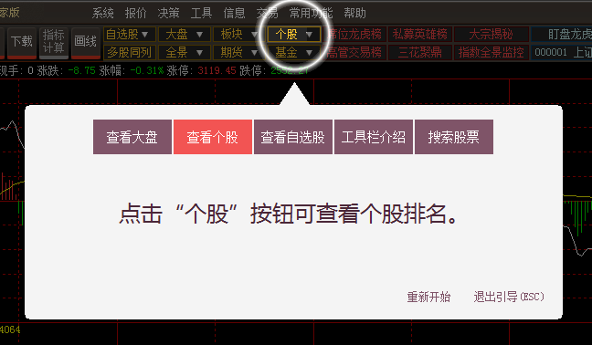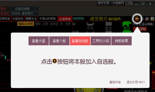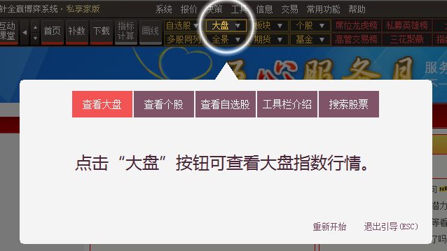 点击“开始新手引导”后,第一步即为“查看大盘”,需要点击“大盘”按钮,进入大盘分时界面,同时引导至下一步。