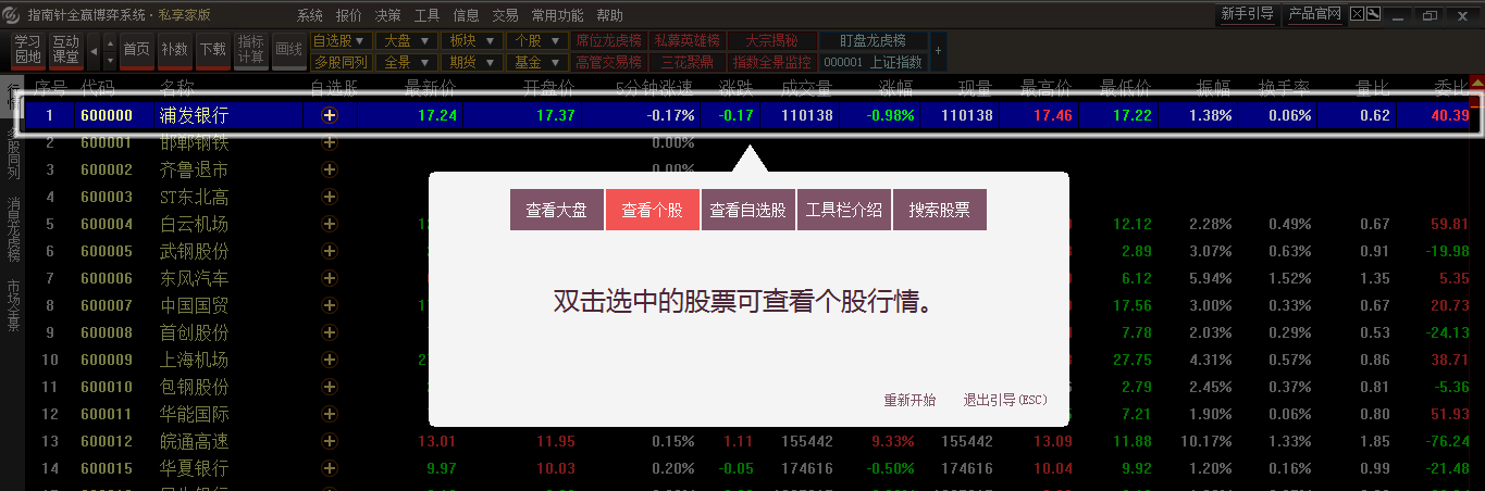 点击“个股”按钮进入行情报价牌界面,用户需要双击选中的股票以进入个股分时界面。