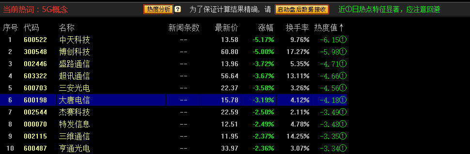 - 热度分析功能可分析板块是否形成显著特征,如果热度值为红色数据表明形成正面热点,数值越大特征越显著,此类股票应积极关注;如果热度值为绿色数据表明形成负面热点,数值越小特征越显著,此类股票应注意回避;如果热度值为白色表明特征不显著。数字符号表示此热度的持续到目前的时间状态,①为距当前日期最近的热度,②③⑤为据当前日期最近两天、三天和五天的热度。