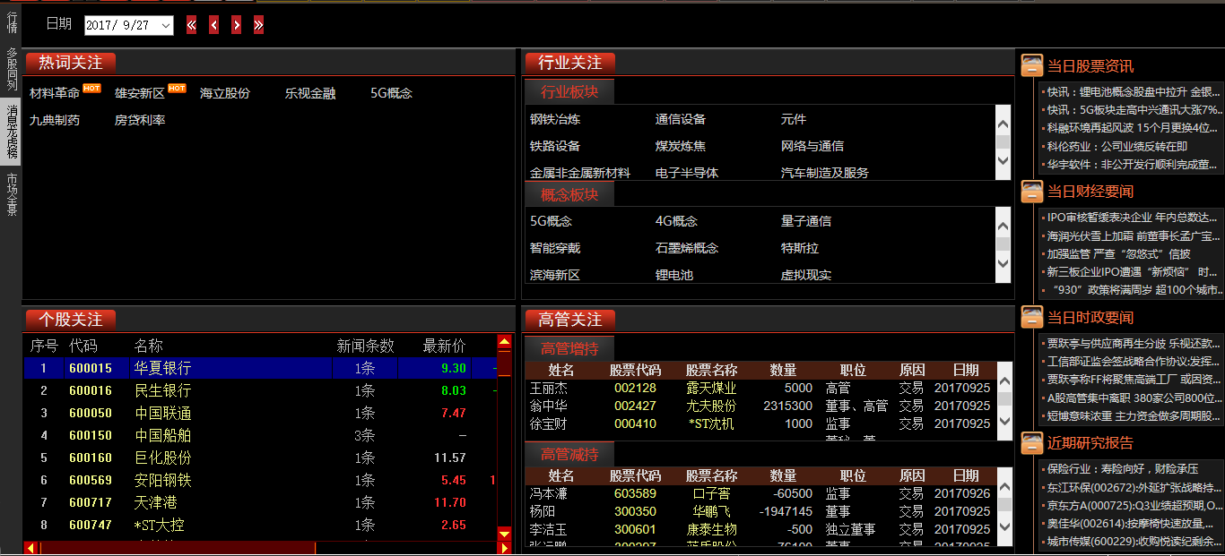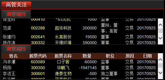 3) 高管关注。从每天的上市公司公告或其他新闻中筛选出来的上市公司高管有增持或减持行为的股票,形成“高管增持”和“高管减持”股票池。分别对有增持减持行为的高管及职位、其所在上市公司、增持减持数量、原因、日期多个维度进行监控。点击查看相关新闻资讯。