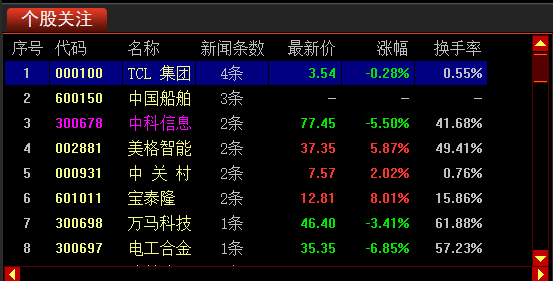 4) 个股关注。从消息面筛选出的有异动特征的股票。