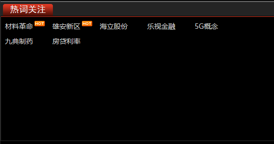 1) 热词关注。当天市场形成的关注度较高的热词。其中带有“HOT”标识的意为热点,可关注度相对较高。热词关注可筛选出当日属于该热词的股票(当日是否属于热词取决于该股票当日是否出现与该词有关联的消息,以及与该股票有关联的信息和热词同步出现的频率)。