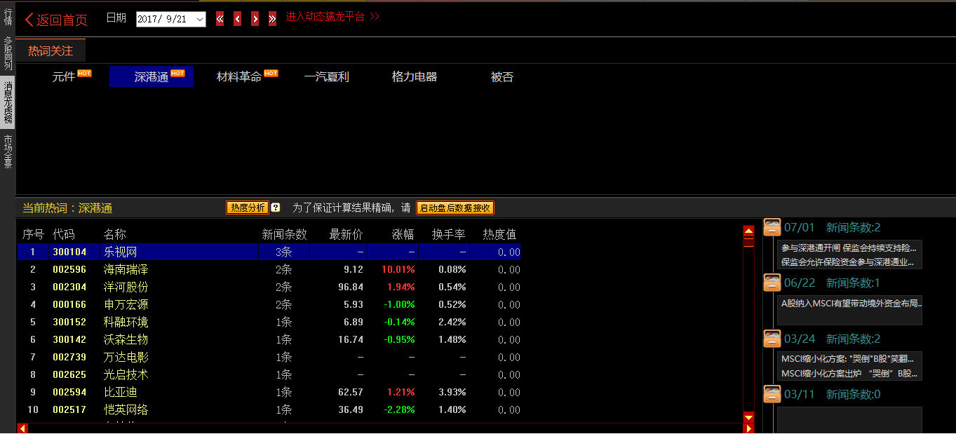 消息龙虎榜功能是对每天的消息面进行分析汇总及在个股行业上的分布情况进行的展示,包括五个功能模块,分别是:热词关注、行业关注、个股关注、高管关注、资讯列表。可以通过时间选择窗口查看历史数据。