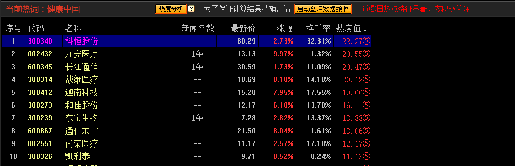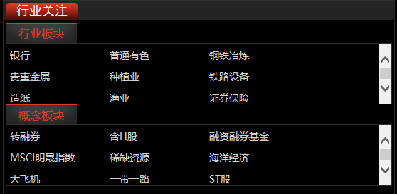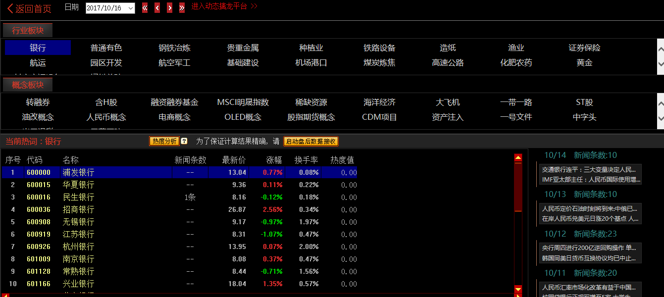 选中任一行业板块或概念板块,下方股票池中将显示该板块的成分股。并且保持完整数据,点击“热度分析”按钮计算该板块中股票的热度值。