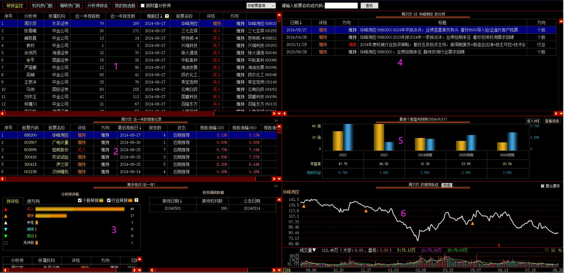 研报监控界面分为6部分,1号区域为近一年有发布报告的券商分析师的集合、2号区域为所选分析师近一年荐股记录,3号区域为近一年所有分析师对所选股票的分析结果;4号区域为所选分析师对所选股票的分析结果,5号区域为所选分析师对所选股票的最新盈利预测、6号区域为所选股票的K线图
