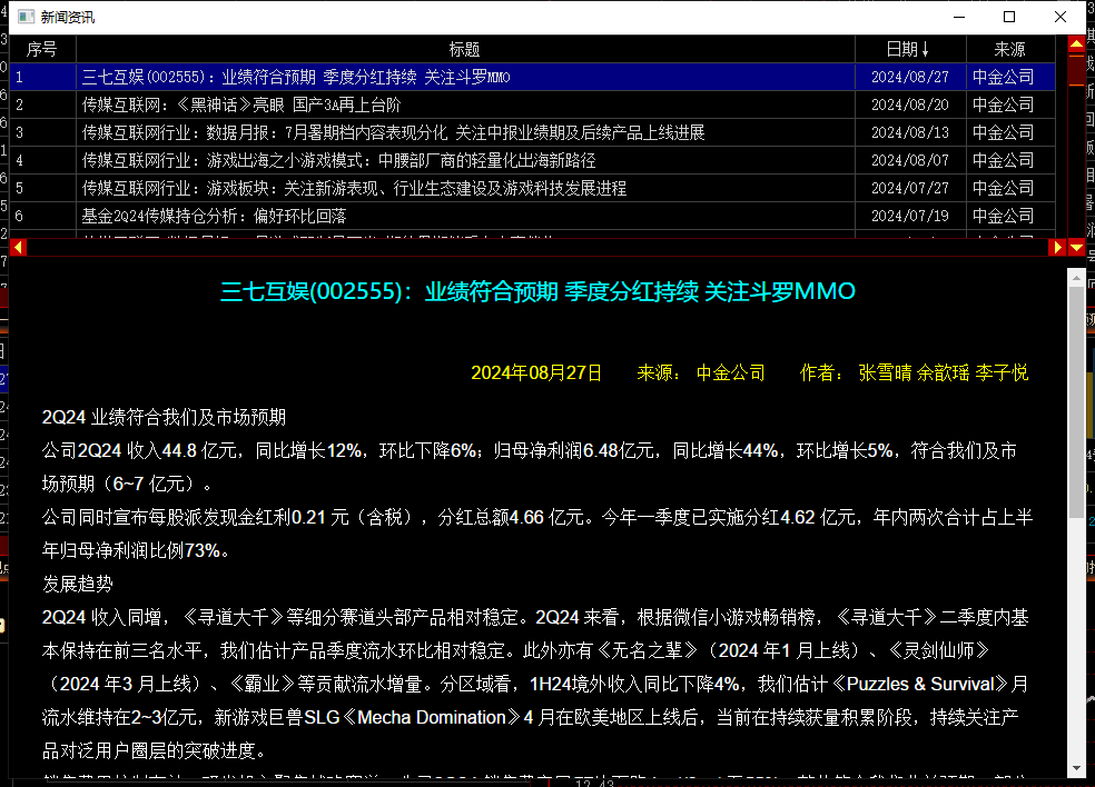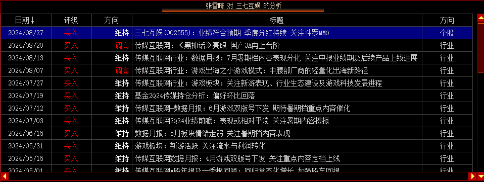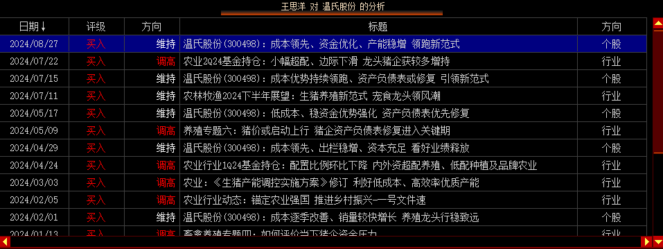 包括分析日期,对所选股票的评级情况、评级调整方向以及所写评级报告的标题,双击某一行可进入报告详情界面。