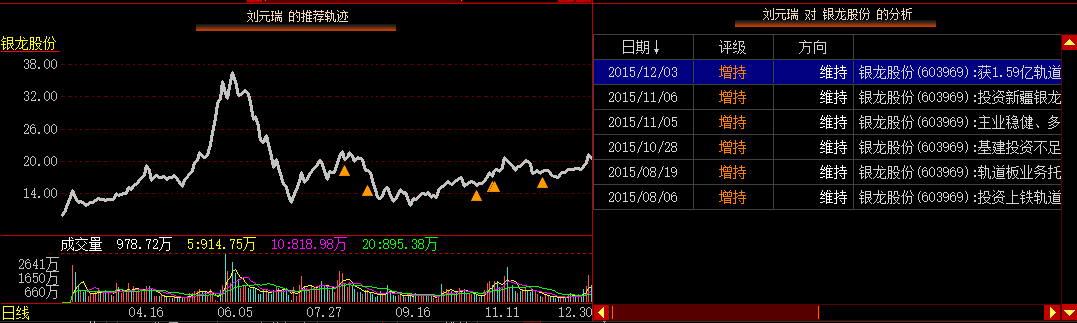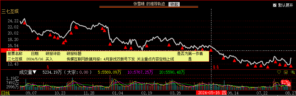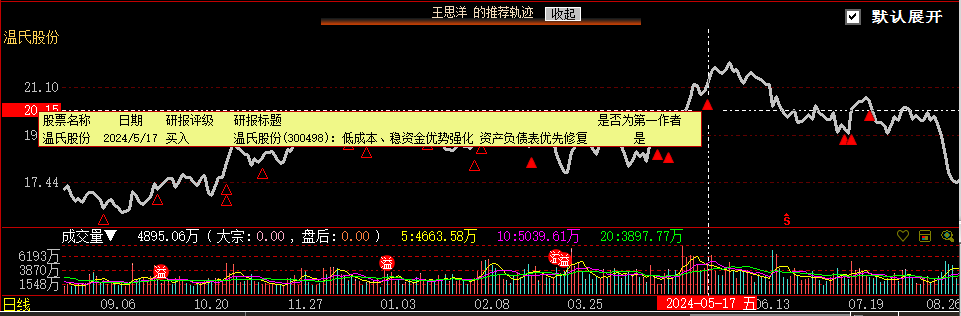 6号区域:所选股票的K线界面(三角形为所选分析师的推荐轨迹,鼠标移动到三角形处可显示发布的研报)