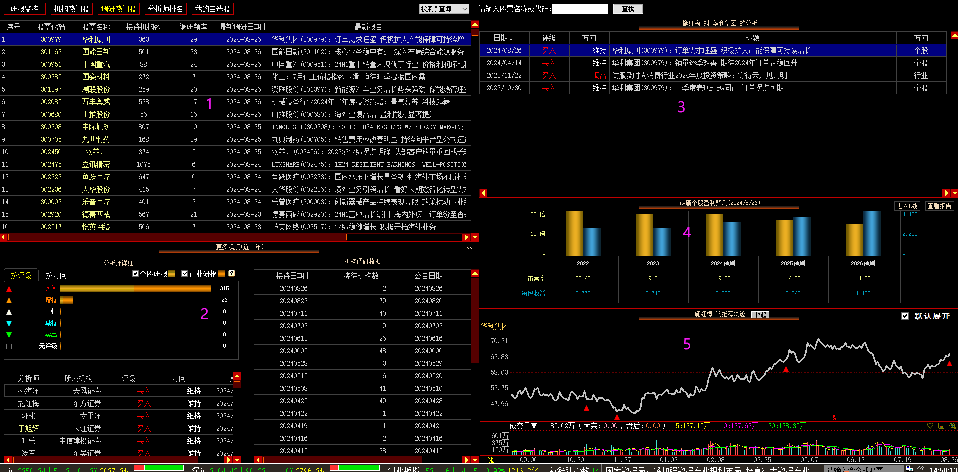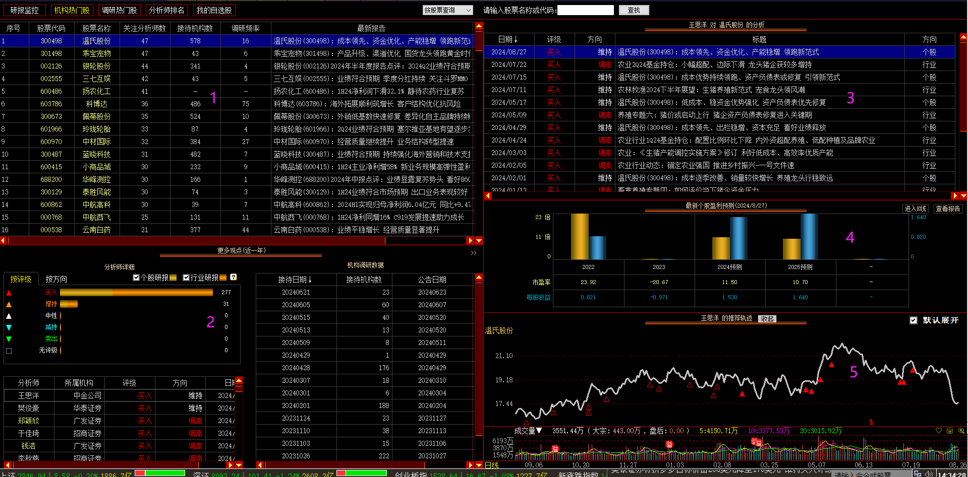 调研热门股为被机构调研频率高的股票。界面分为5部分,1号区域为所有调研热门股详情,2号区域为所有分析师近一年对所选热门股的所有分析结果,3号区域为最近发布报告的分析师对所选热门股的分析结果、4号区域为该分析师对所选热门股的最新盈利预测、5号区域为所选热门股的K线界面。