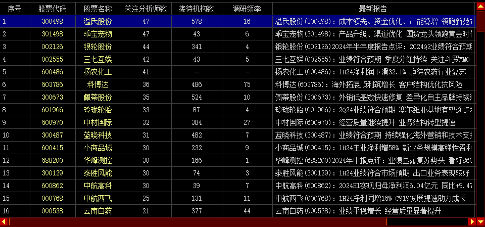详情界面包括热门股股票代码、股票名称、关注该股的分析师数、接待机构数、调研频率、关于该股的最新报告、最新报告的分析师以及最新报告的发布时间。