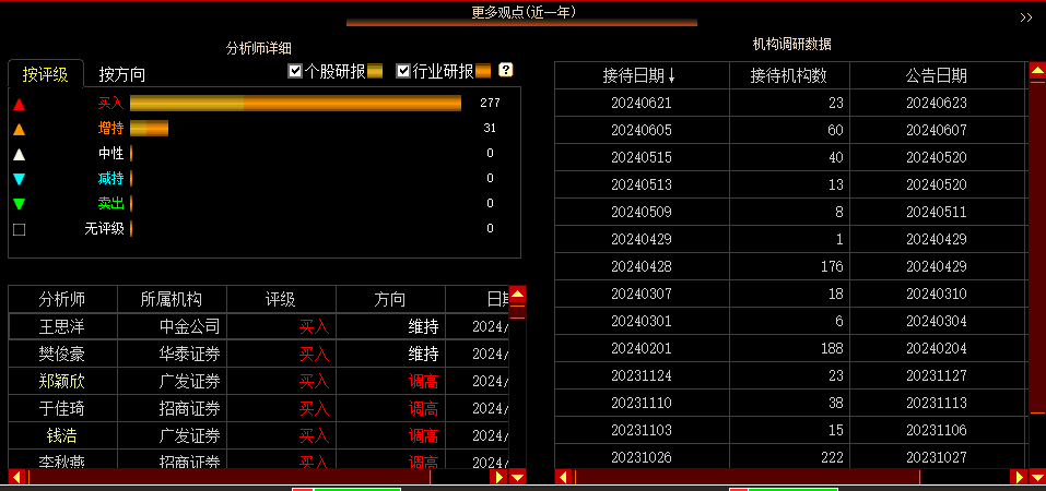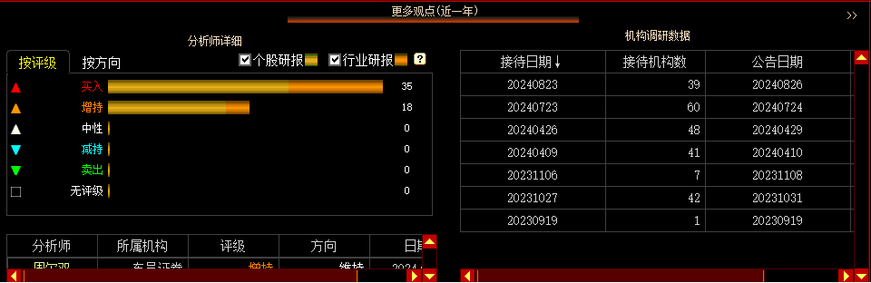 鼠标选中1号区域中的某一行时,即可显示所有分析师近一年对所选热门股的所有分析结果(包括分析师名称、分析师所属机构、对所选股票的评级情况、评级调整方向、评级日期)、按照评级和按照方向的分析汇总情况以及机构调研数据。