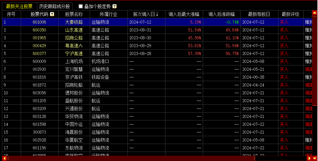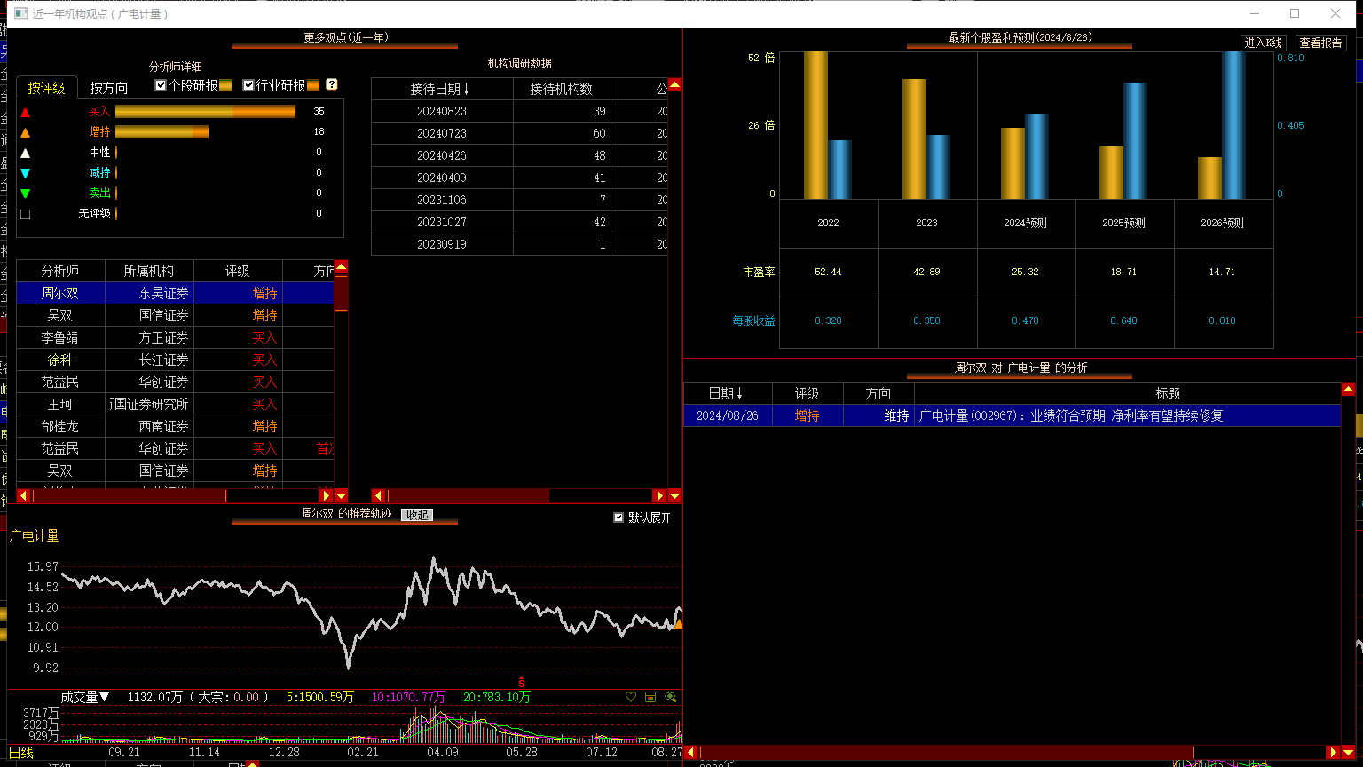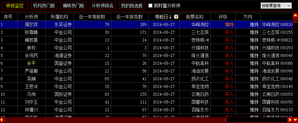 2号区域:所有分析师近一年对所选热门股的所有分析结果