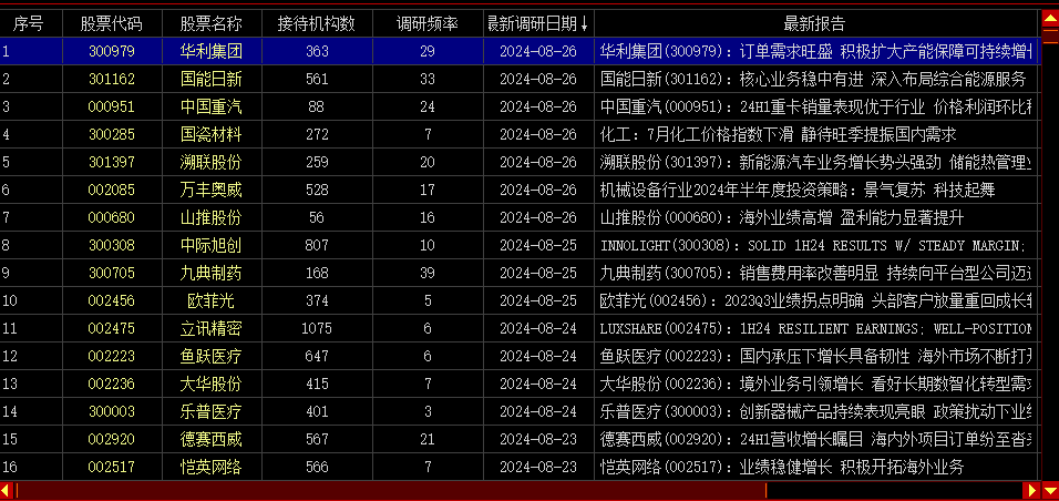 详情界面包括热门股股票代码、股票名称、接待机构数、调研频率、最新调研日期、该股的最新报告、最新报告的分析师以及最新报告的发布时间。