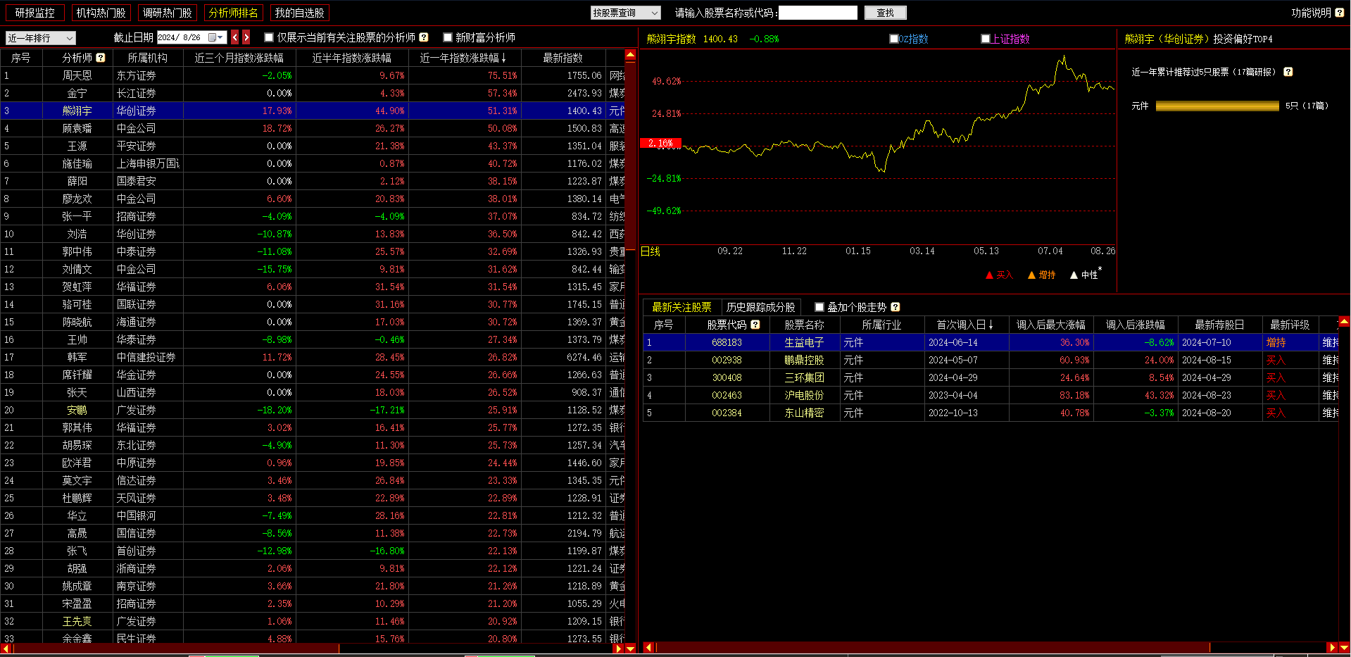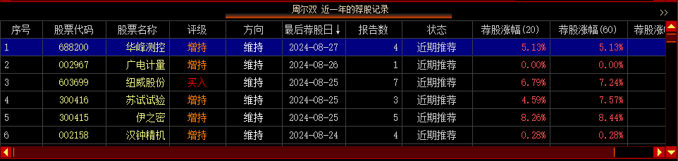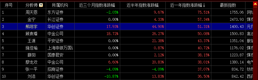 鼠标选中1号区域中的某一行时即可显示所选分析师近一年的荐股记录。