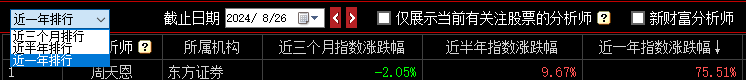 左侧为某一时间范围内的分析师排名,时间范围可选近一年、近半年、近三个月。并且可以筛查看选当前有关注股票的分析师以及新财富分析师。