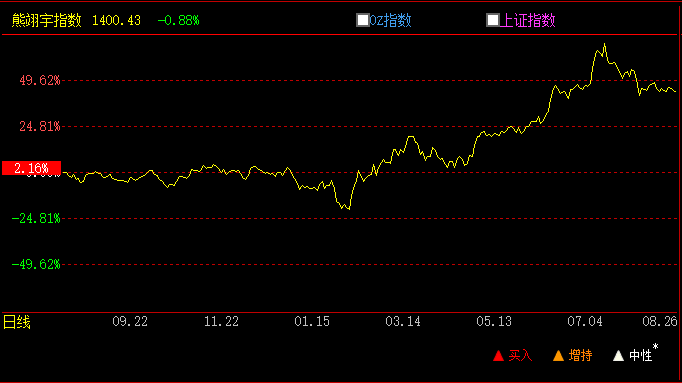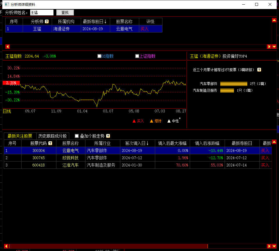 分析师走势图展示了近一年该分析师指数的走势变化,图中可叠加0Z指数和上证指数以及个股走势。
