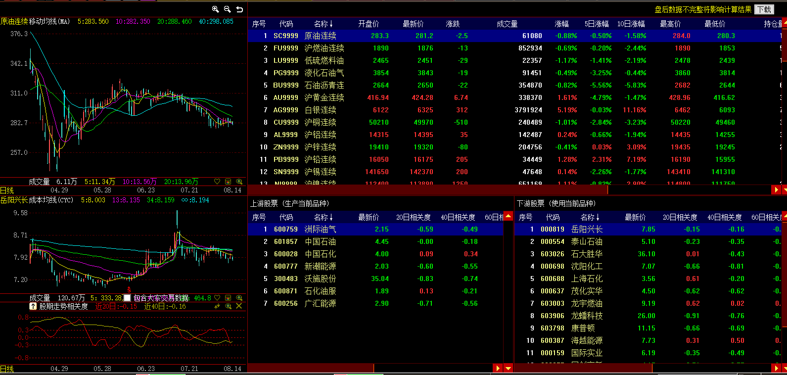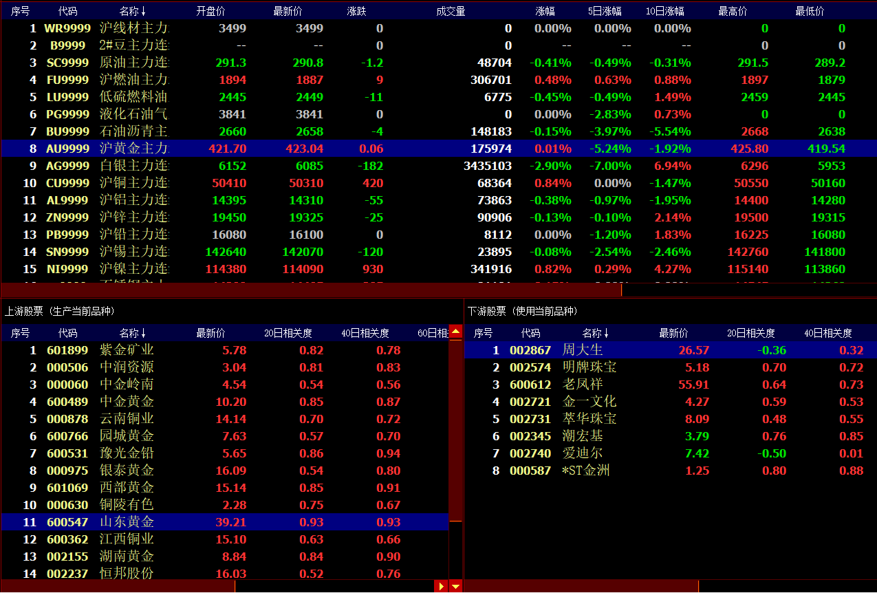 点击选中某个商品期货主力连续合约,左侧展示该期货合约的日K线图,而下方列表中将列出主营业务与选中的期货品种相关联的股票,其中上游股票中是生产该期货品种的企业,下游股票中是利用该期货品种的企业,见下图