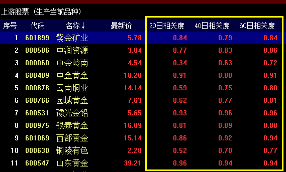 在左下方指标窗和右边股票、期货列表中均设置股期走势相关度指标,用来度量期货品种与股票走势的相关度,见下图。