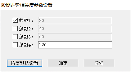 弹出股期走势相关度参数设置对话框,可根据需要对计算的日期范围进行调整、显示或隐藏,见下图:
