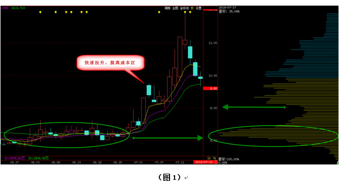 在前面《如何看清主力锁仓股》中我们为大家介绍了主力对高度控盘股进行锁仓拉抬的手法,但是在股市当中,高度控盘即便是对主力来说也不是件容易的事情,所以实际操作中我们会发现很多个股的筹码是随着股价的上升而不断上移的。于是大家就有了一个疑问,既然主力是在低位进行的建仓,那么筹码上移是不是就可以理解为主力已经撤退了呢?如果是主力撤退了,股价为什么还能不断的上涨?如果主力没有撤退,我们又如何才能估算出主力控盘的程度呢?下面就让我们带着这些疑问来一起研究一下,首先见图1: