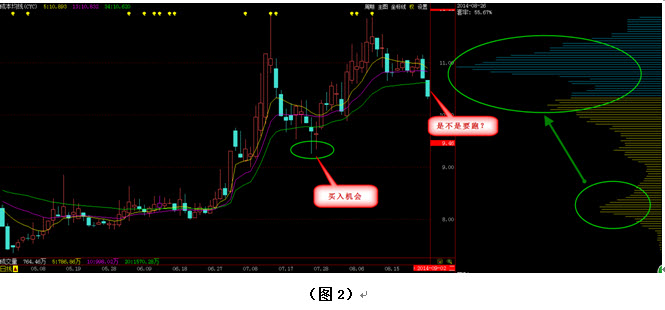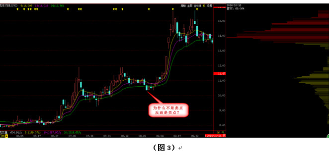 在图2中我们看到,过了几天后,该股盘中的确给了我们在9元附近逢低买入的机会,而且连续两天都有出现,因此事先做好准备的人应该不难买到。之后该股果然没有继续下跌,而是再次上行,但上涨到前期高点附近时又一次遇到了压力,股价再次回调。如图2所示,这次回调时我们发现的筹码密集峰出现了快速的向上转移,而一根光头光脚的中阴线更是跌破了34日成本均线。投资者无不心惊,很多人认为该股趋势已经走坏,应赶紧出局。那么如果您这时卖出股票,究竟有没有做对呢?见图3: