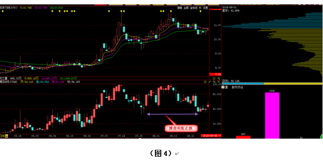 与图2相比,图4中多了几根K线,同时我们在下方还加入了一个指南针的老指标,它就是博弈K线,您只要在键盘上输入“CYQK”即可将这个指标找到并调出。博弈K线数值对应的就是场内获利盘的多少,如图4中所示,在第一次股价回调到9元附近时博弈K线形成了一个低点,也就是说主力不希望场内的获利盘降低到这个数值之下,否则就有可能触及到主力自身的利益。而在第二次调整时我们发现,尽管筹码发生了上移,尽管股价跌破了34日成本均线,但是博弈K线并没有跌破第一个调整时的低点,并且在这个位置又一次产生了止跌。那么主力为什么要保证这些获利盘不被套呢?大家不妨想想,谁的筹码被套你不在乎?谁的筹码被套你会很在乎?