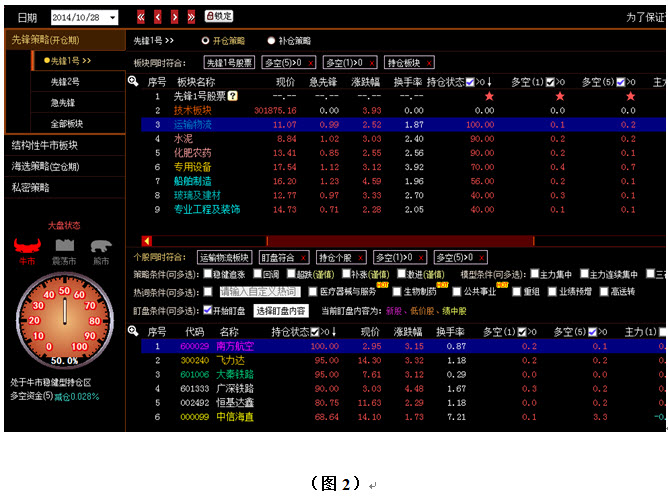 如图2所示,我们先看10月28日的情况,由于10月28日大盘操盘策略给出的是开仓信号,所以此时大家可首选先锋1号策略来进行选股。当我们用鼠标在界面左侧点中“先锋1号”后,在右侧上方列表中出现的就是开仓当天由系统为大家锁定的所有符合开仓策略的板块,当天一共有20个不同的板块入围。随后要做的就是精选板块与个股,我们先在板块列表的标题栏中找到持仓状态,多空(1),多空(5)这几项,然后在他们各自后面的小方框中打上勾,即表示我们想找出的板块是持仓状态大于0的、五日多空资金处于增仓的,且10月28日当天多空资金也还在增仓的板块,筛选之后所剩的板块就只剩下7个了。对这7个板块,我们再按持仓状态的大小进行排序,因为持仓量的大小是软件通过计算得出的,一般来说持仓量越大,则表明软件认为其后期潜力也最大。那么在图2中,我们锁定的就是运输物流板块。用鼠标点中该板块后,在右下方的列表中便会出现该板块中的相应个股。随后用与选板块相同的方式,我们在个股列表的标题栏中也找到持仓状态,多空(1),多空(5)这几项,并在他们各自后面的小方框中打上勾。同时为了更好的结合行情,大家还可以在个股列表上方找到盯盘条件,并勾选其后的“开始盯盘”,在不人为设定盯盘内容的情况下,系统会按当前盯盘龙虎榜的情况自动锁定领涨类股票的类型,比如在10月28日时,系统锁定的盯盘内容就是新股、低价股、以及绩中股。设置完毕后,我们还是按持仓大小对个股进行排序,从图2中可以看到,排在第一位的是南方航空这只股票,故此您可以在10月28日当天或10月29日开盘时及时买入该股。