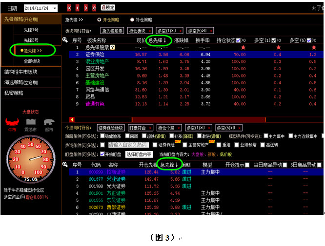 如图3所示,由于11月24日大盘操盘策略出现的是在上涨途中的加仓买入点,所以此时我们的胆子就可以大一点,策略上首选的就不再是先锋1号,而是急先锋策略。随后在板块列表中,还是勾选持仓状态,多空(1),多空(5)这三项,但是在排序的时候,我们稍做一下变化,不再对持仓状态的多少进行排序,而是对急先锋数值的大小进行排序,谁排在前面,说明谁的上涨速度越快,换句话说,它就是当前行情中的最强者。同理,对个股的筛选也是同样。于是我们在11月24日将目标锁定在了证券保险板块中的招商证券身上。